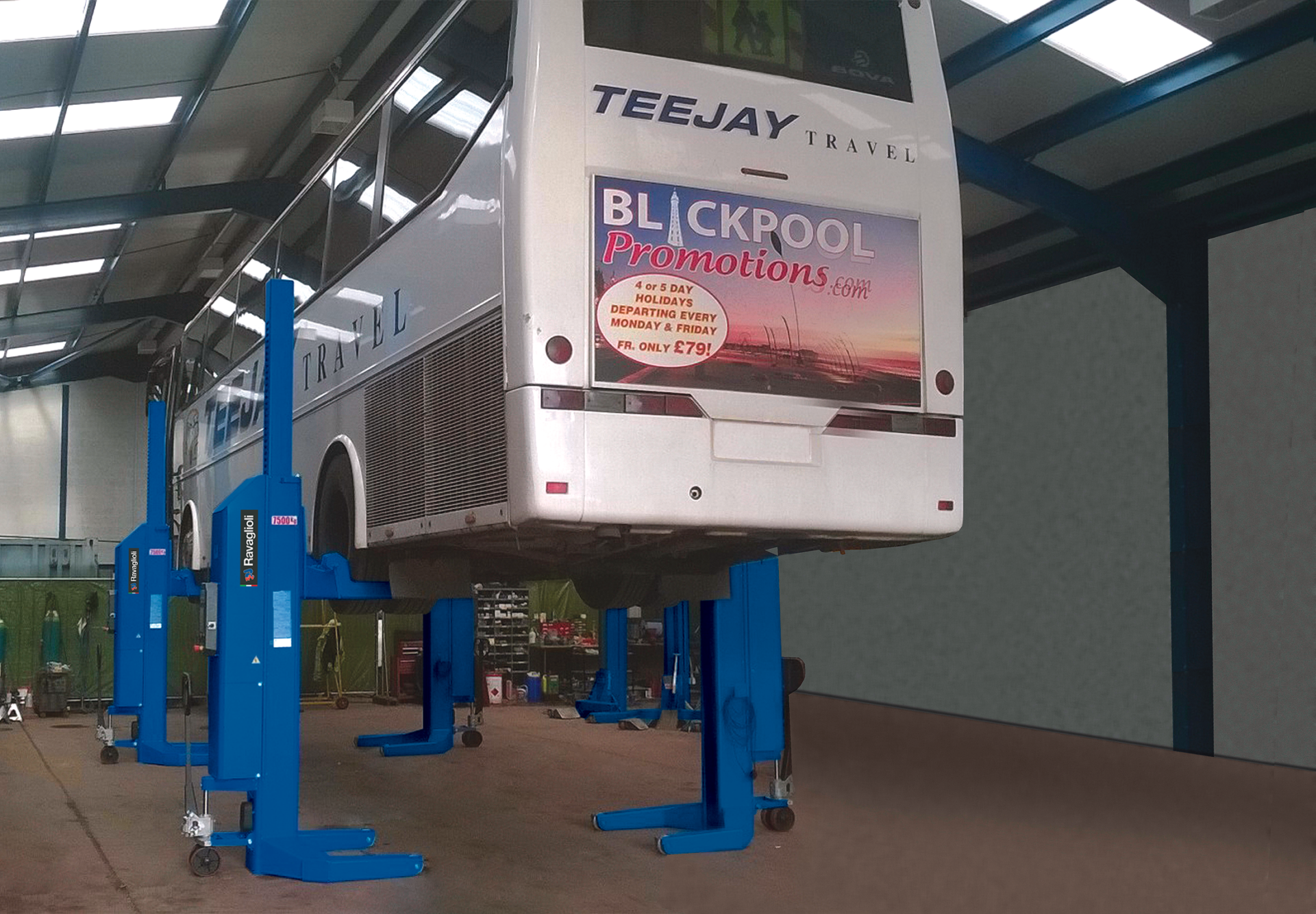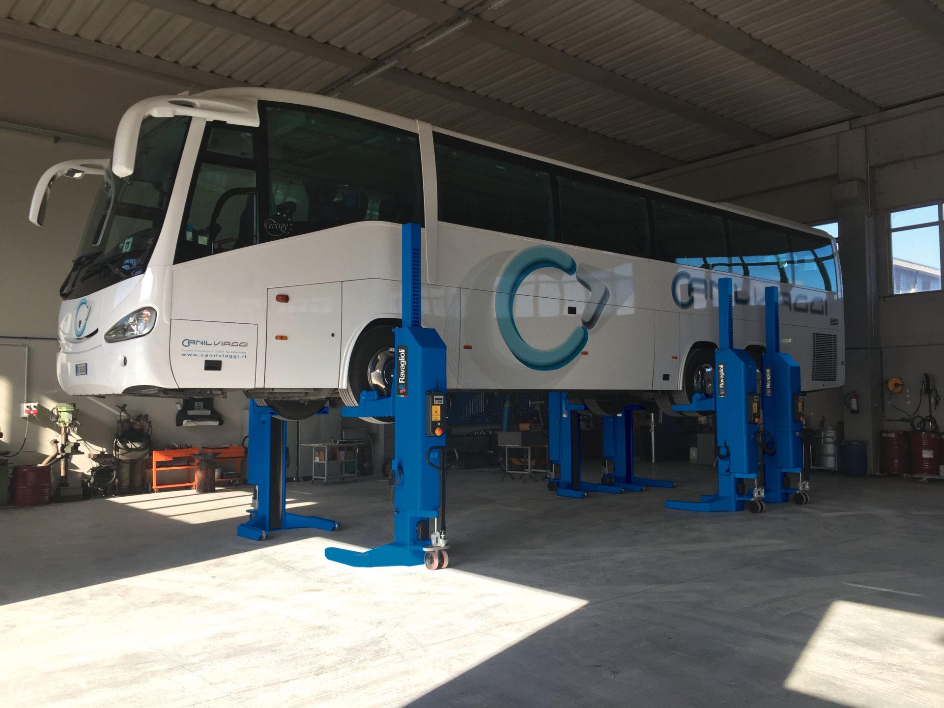 Mobile columns to lift different vehicles – Perfect access to the vehicle. Allows tire and brake service.